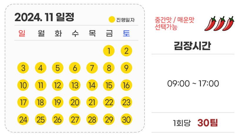 ◈ 예약 전 체크사항 : 김치통, 고무장갑, 앞치마 등 준비물 잊지 말고 챙겨가시고 부가서비스로 수육, 밥, 된장국 제공합니다. 추가로 양념, 고춧가루 현장 구매 가능합니다. 주차장이 행사장에서 100M 거리에 있는 점 참고하시기 바랍니다.