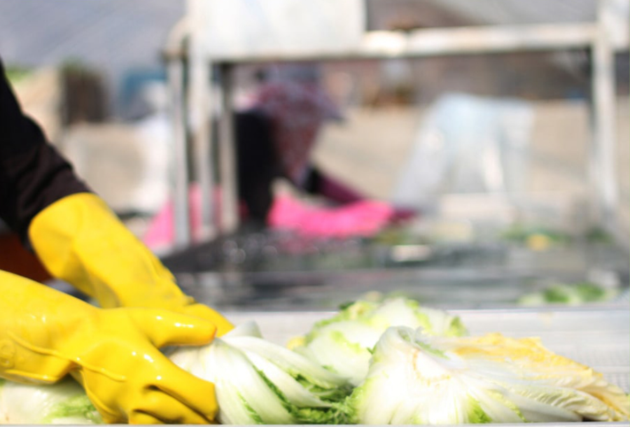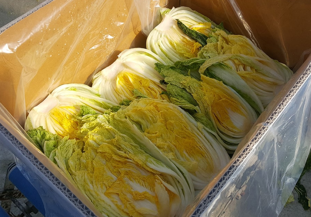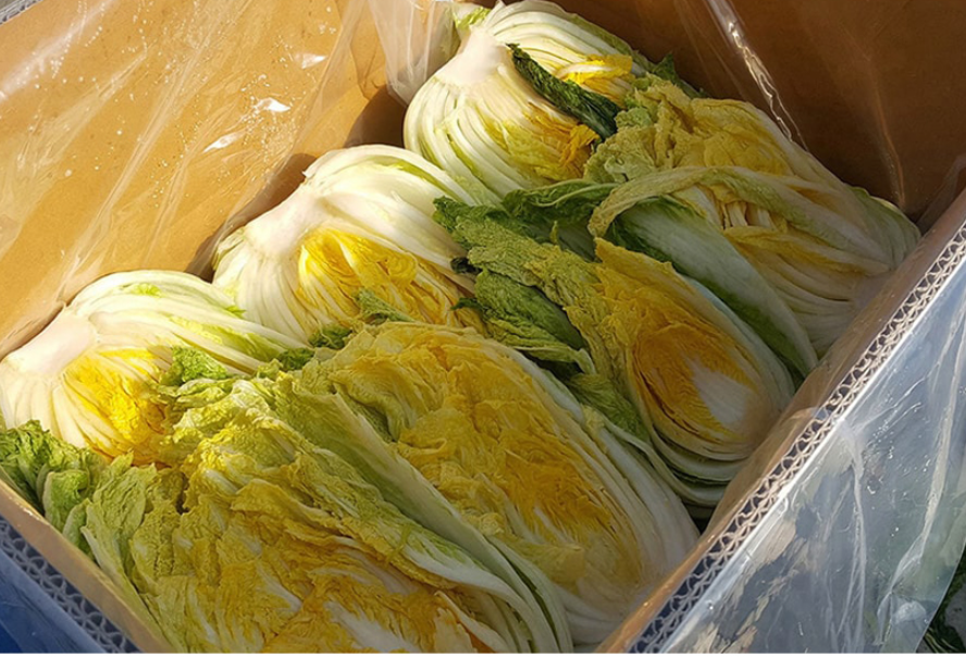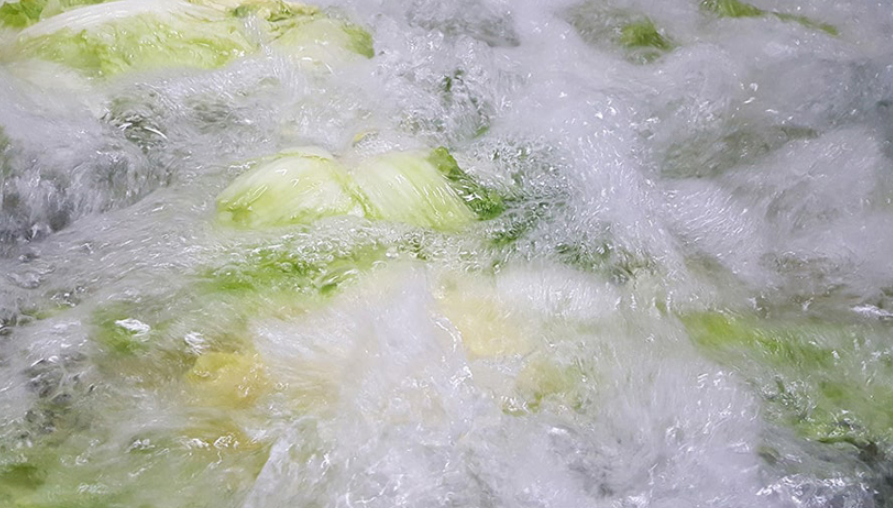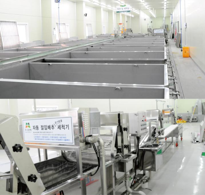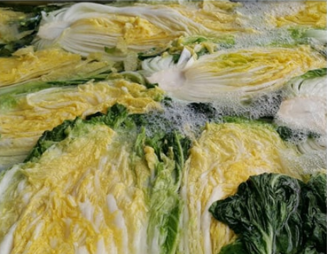 - 절인 배추를 수질검사 완료한 지하 암반수와 초음파세척기로 세척 후 수작업으로 3번 더 세척한다.
