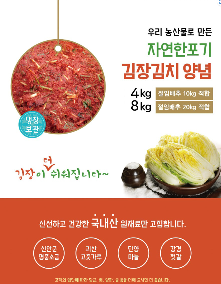- 김치양념 8kg : 110,000원(절임배추 20kg에 적당)