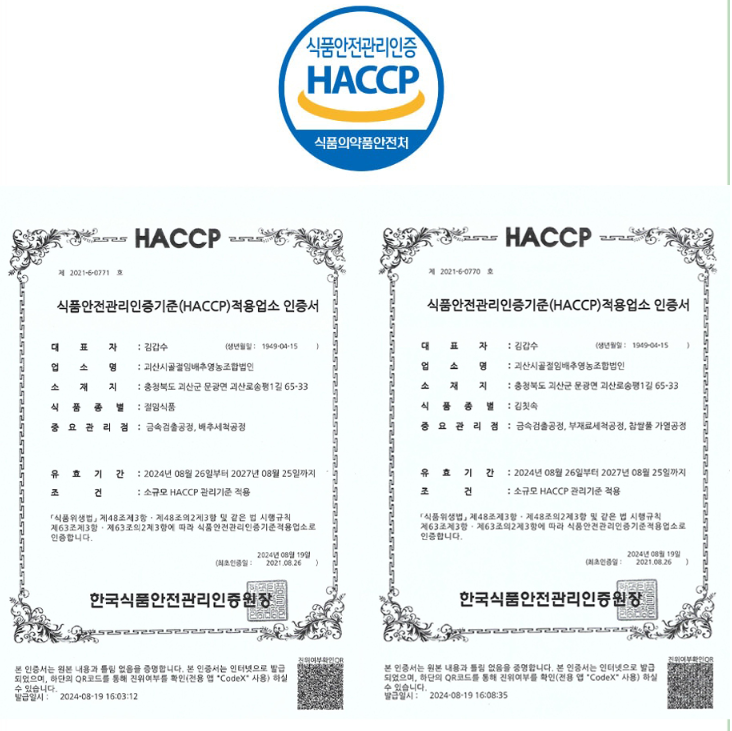 - 식품의약품안전처 주관하는 식품안전관리인증 HACCP(헤썹) 인증받은 농가