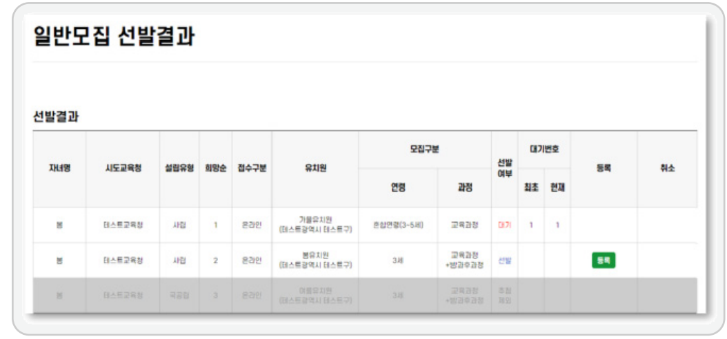 • 선발여부가 ‘추첨제외’인 경우는 상위 희망 유치원에서 선발된 경우입니다.