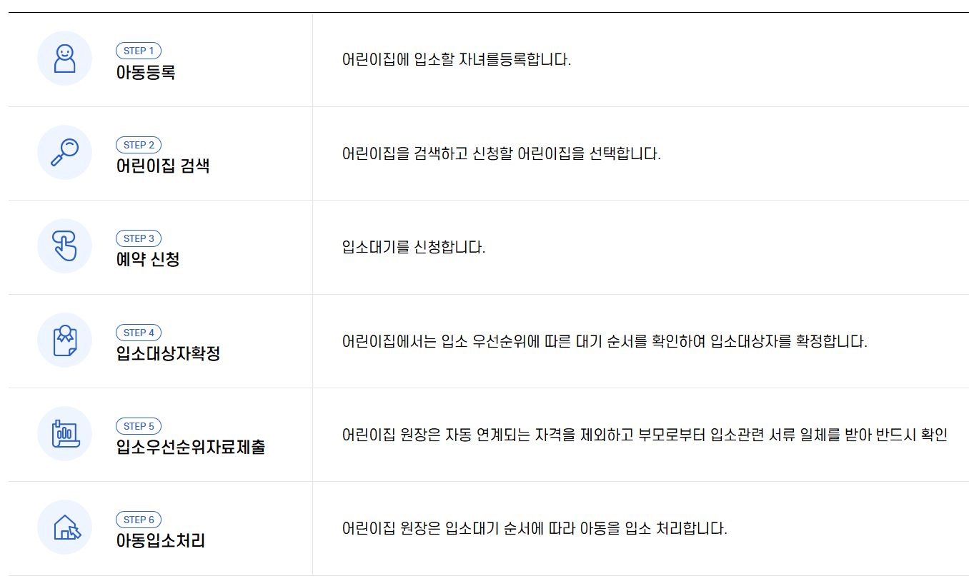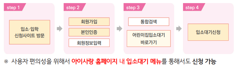 어린이집에 입소를 원하신다면, 어린이집 입소대기 바로가기를 클릭하신 후 다음 단계를 따라 신청하시면 됩니다:
