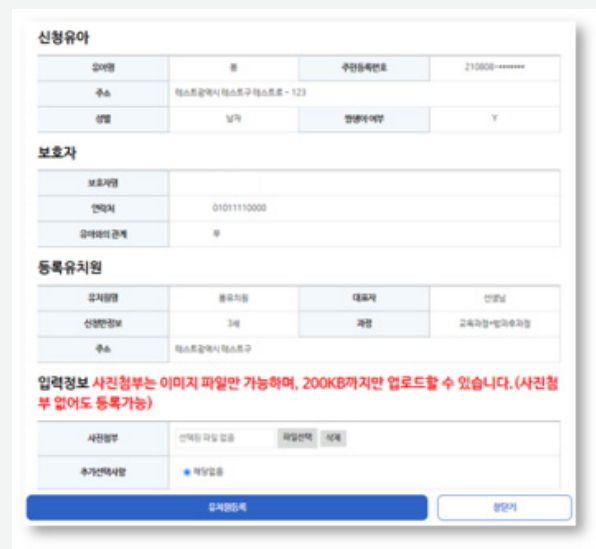 ③ [등록] 버튼을 클릭하면 다음과 같은 원서접수창이 활성화됩니다. 자녀사진 첨부는 필수가 아니라 선택사항이며, 유치원 원서접수 정보를 확인 후 [유치원등록] 버튼을 클릭하면 ‘등록’이 최종 완료됩니다. 맨 아래 부분에 추가선택사항이 있는 경우 해당내용을 선택하시면 됩니다.