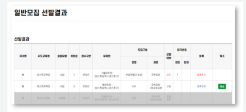 ① ‘선발여부’가 ‘대기’인 경우, 일반모집 등록 마감 이후 대기자 변동 기간 동안 대기번호가 변동되어 ‘선발’될 수도 있기 때문에 지속적으로 대기번호를 확인하시기 바랍니다.