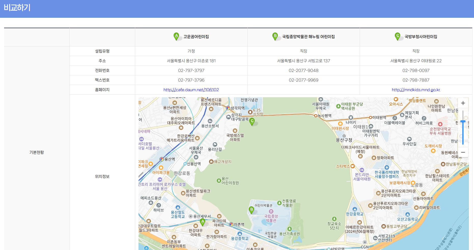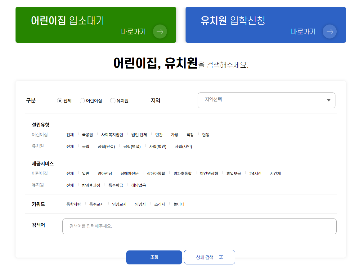 통힙검색하기 : 원하는 지역의 어린이집을 검색할 수 있습니다. 검색 시 다양한 필터를 이용하여 맞춤형 검색이 가능합니다. 내가 거주하는 지역선택 후 구분, 설립유형, 특성, 키워드, 검색어등을 사용하여 어린이집, 유치원을 조건에 맞게 조회할 수 있습니다.나의 자녀가 다니기를 원하는 어린이집 3개소 혹은 유치원3개원을 선택하고 비교하기 버튼을 클릭하면 선택한 어린이집,유치원을 비교할 수도 있습니다.여러곳을 염두해 두신 상태에서 아직 선택을 못하셨다면 '통합검색하기' 기능이 유용하게 활용될 것으로 생각됩니다.통합검색하기는 회원가입을 안 한 상태에서도 볼수 있습니다.