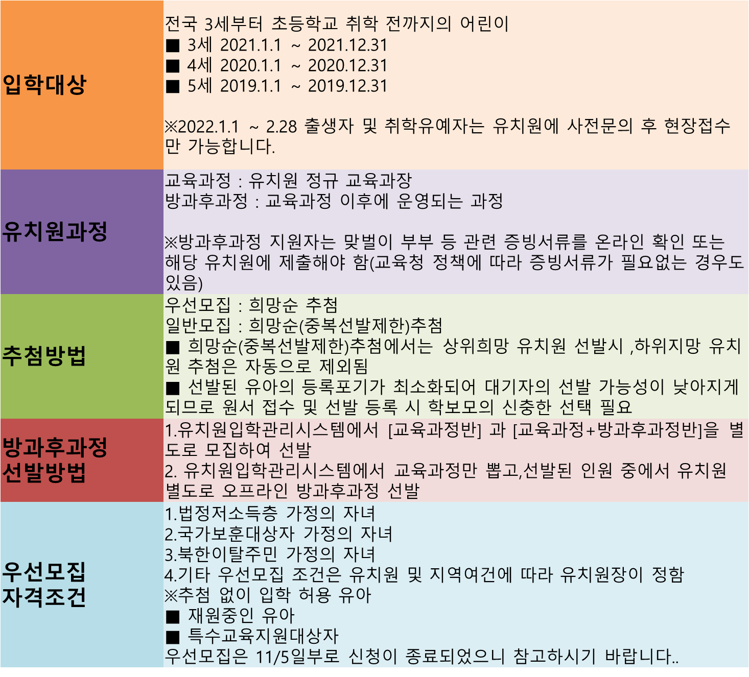 • 유치원별 방법에 따라 우선모집에서 신청하지 못한 방과 후 과정을 일반모집에서 신청할 수 있으니 꼭 해당 유치원의