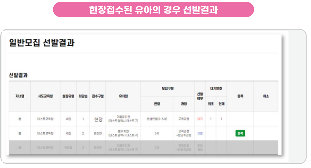 ※ 일반모집을 현장에서 접수한 유아도 선발결과 메뉴에서 선발결과확인이 가능합니다. 단, 현장접수의 경우 선발되었더라도 온라인에서는 등록이 되지 않습니다. 현장접수 등록의 경우 현장접수한 유치원으로 문의하시기 바랍니다.