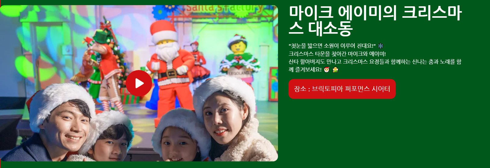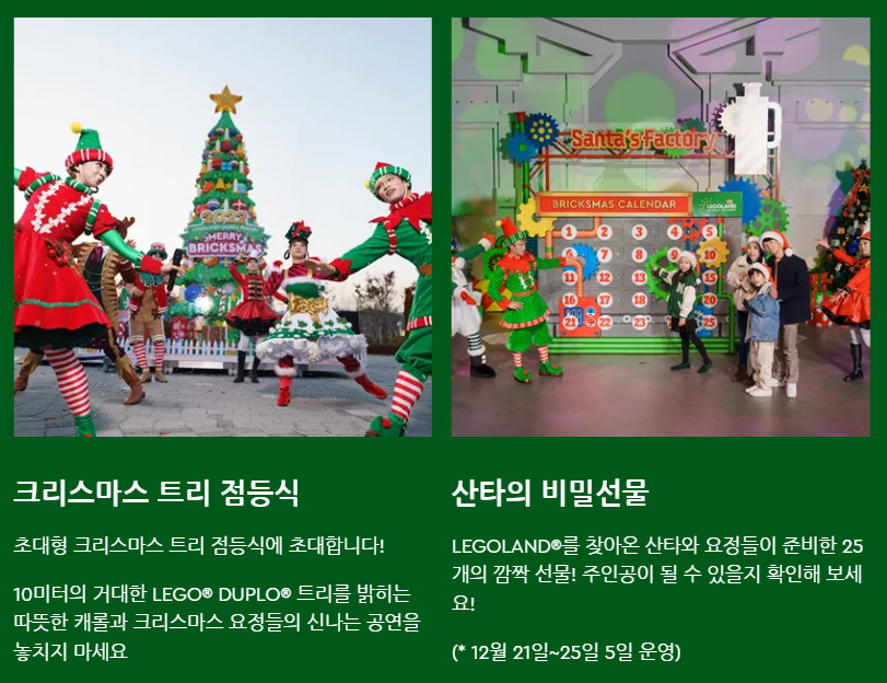 1일권 구매만으로도 LEGOLAND의 특별한 이벤트, 공연, 실내 체험존 등 크리스마스 마법을 즐길 수 있는 "Merry Bricksmas" 와 보다 특별한 크리스마스를 위해 레고랜드에서 마련한 산타가 방으로 찾아오는 산타의 깜짝 방문 패키지에 대해서 소개해 드리겠습니다.
