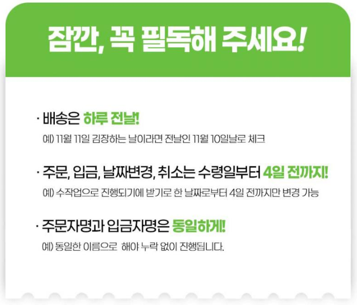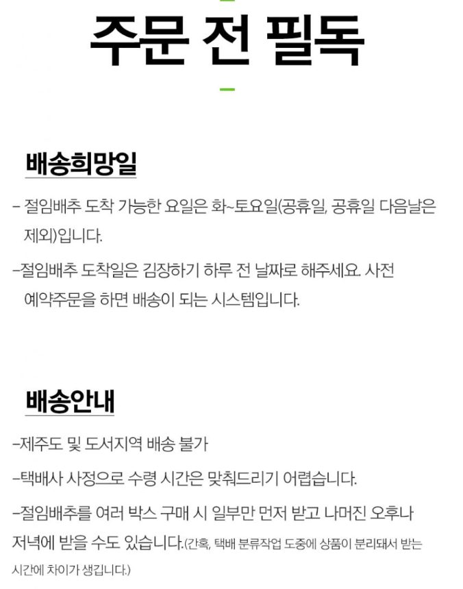 참고로 포스팅하는 농가 순서는 해남군 직영 해남미소몰에서 표시하는 높은 가격순으로 나오는 페이지 기준으로 작성되었습니다. 배송은 입점된 대부분의 농가들이 도착일 기준 11/16일 ~ 12/28일까지로 되어있습니다.12/24일 까지만 도착가능한 농가도 일부 있으니 상세페이지에서 확인해 주세요.배송비는 대부분 무료입니다.