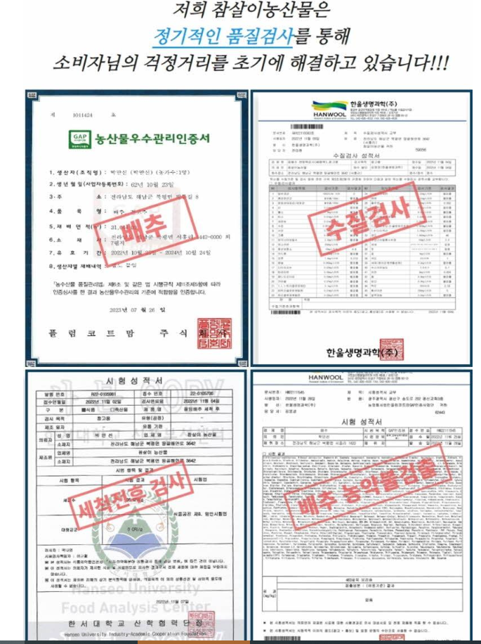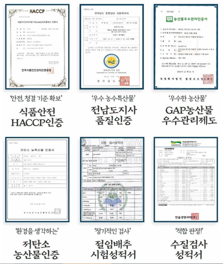 * GAP(농산물우수관리)표시는 농산물우수관리인증을 받았다는 것을 의미하는 것으로서 국내에서 재배되는 농산물 중 생산단계부터 수확, 포장, 유통단계까지 위해요소(농약, 중금속, 미생물 등) 110개 항목의 관리기준을 통과한 경우에만 표시할 수 있습니다.