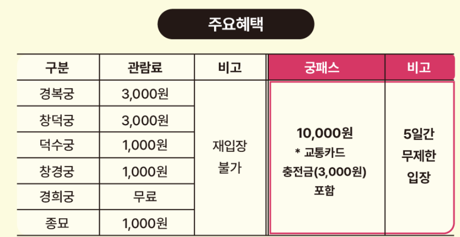 - 이용장소 : 경복궁,창덕궁,창경궁,덕수궁,경희궁,종묘 무려 서울의 5대 궁을 축제기간 동안 무제한 방문하실 수가 있습니다.