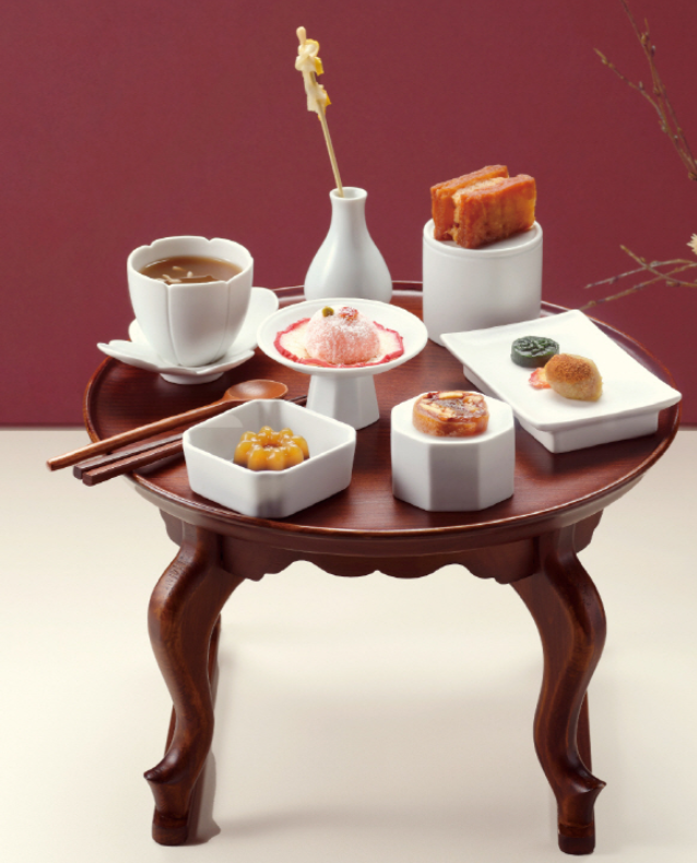 ○ 1인 다과상(25,000원) : 참외 정과/청태다식/천도 복숭아 정과/밤초와 율란/곶감 말이/가배과편/약과 샌드/사과 단자, 홍옥 정과자/녹차 식혜