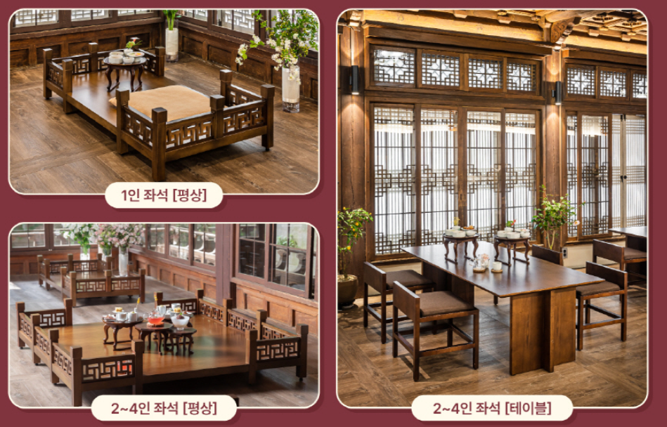 - 좌식 공간은 1인 또는 2~4인 예매 가능하며, 입식 공간은 2~4인 예매 가능합니다.