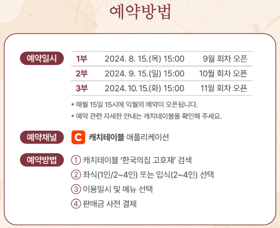 ○ 예매방법 : 캐치테이블 '한국의집 고호재' 검색 → 좌식, 입식 공간 / 인원 선택 → 이용일시 및 메뉴 선택 → 판매금 사전 결제